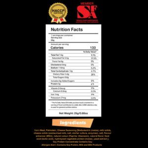 Corn meal, palmolein, super cheese seasoning, isolated soy protein, natural color, natural flavor, milk solids, salt.